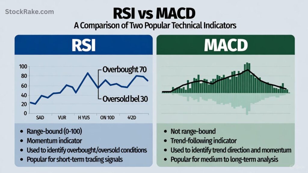 Both RSI and MACD (Moving Average Convergence Divergence) are momentum tools, but they measure different aspects: